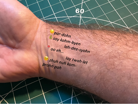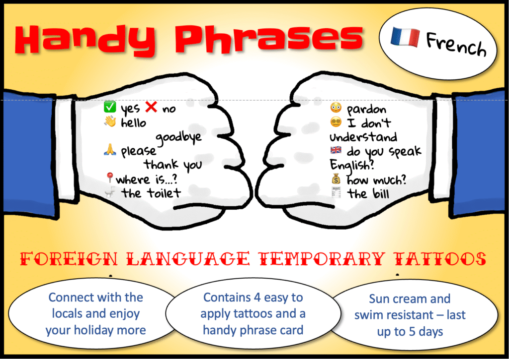 Handy Phrases are temporary tattoos that you can apply to the back of your hand or the inside of your wrist to give you ready access to the most basic foreign phrases while you are away on holiday.